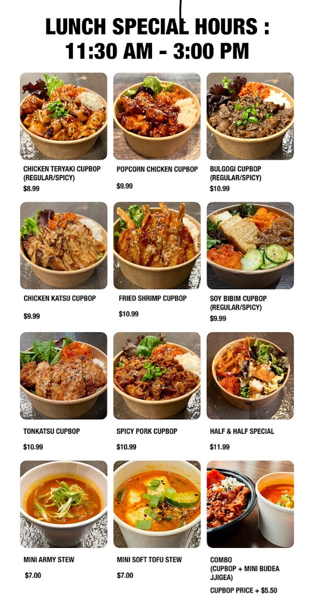 The offerings are diverse, featuring a variety of Cupbop options like the Chicken Teriyaki and Bulgogi, each served with steamed rice and vibrant salads for around $11 to $14. For BBQ enthusiasts, the marinated Pork Belly and Cheese Spicy Chicken steal the show, complete with rich, savory sauces and an array of sides.